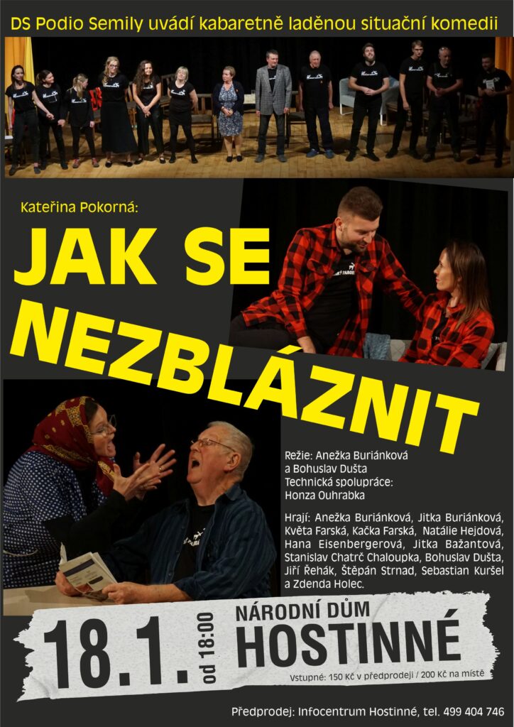 DS Podio Semily uvádí kabaretně laděnou situační komedii. Vstupné 150 Kč předprodej/200 Kč na místě. Předprodej v IC Hostinné.